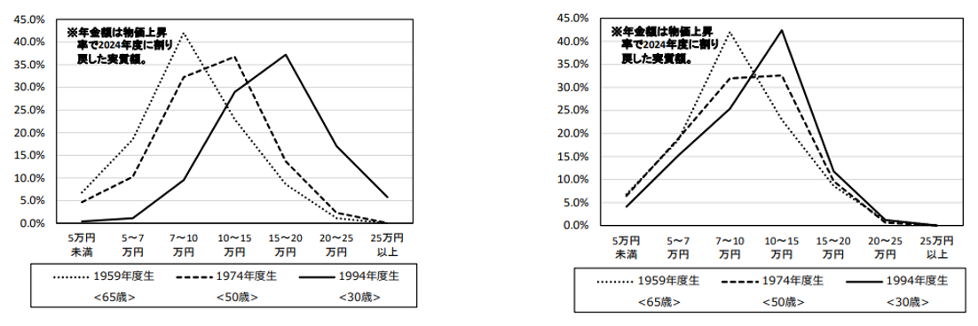 左:成長型経済移行・継続ケース(実質賃金上昇率(対物価)1.5%):1994年生まれの女性は、約35%の方が月々15~20万円の年金を受け取ると想定されている(1959年生まれの女性の場合は10%弱)